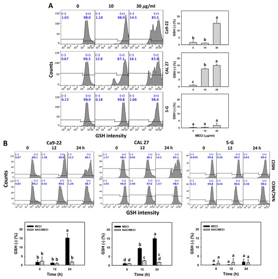 GSH assay. (A) GSH change. Except for S-G cells, other cells were oral cancer cells. After 24 h MECI incubation (0 (0.1% DMSO in the medium), 10, and 30 μg/mL), cells were applied to a GSH assay. (−) spots were specified for GSH (−). (B) Impact of NAC on MECI-induced GSH change to oral cancer cells. After pretreating with NAC, cells were post-treated with MECI (30 μg/mL) for 0, 12, and 24 h. Data, mean ± SD (n = 3). For the same cell line, columns showing non-overlapping letters differ significantly (p < 0.05).