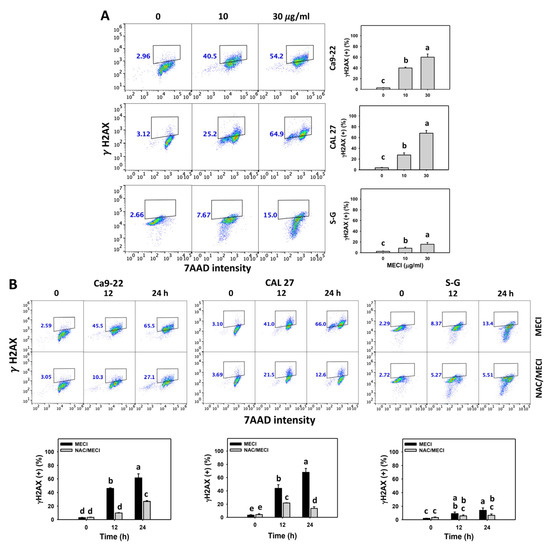 γH2AX assay. (A) γH2AX change. Except for S-G cells, other cells were oral cancer cells. After 24 h MECI incubation (0 (0.1% DMSO in the medium), 10, and 30 μg/mL), cells were applied to γH2AX assays. (+) spots were specified for γH2AX (+). (B) Impact of NAC on MECI-induced γH2AX change to oral cancer cells. After pretreatment with NAC, cells were post-treated with MECI (30 μg/mL) for 0, 12, and 24 h. Data, mean ± SD (n = 3). For the same cell line, columns showing non-overlapping letters differ significantly (p < 0.05).