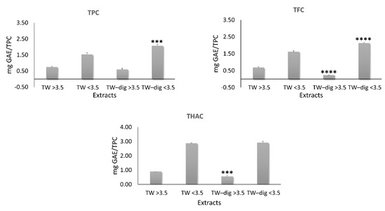 Normalized total phenol content (TPC), total flavonoid content (TFC), and total hydroxycinnamic acid content (THAC) of high and low mw fractions of the aqueous extract by the TPC of the corresponding extracts. Significant differences between digested and undigested extracts are denoted by symbols: *** p < 0.001 and **** p < 0.0001.