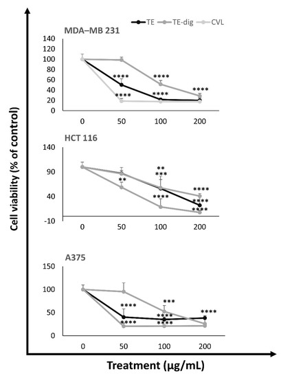 Antiproliferative activity of TE, TE-dig, and CVL on three representative human cancer cell lines: breast (MDA-MB 231), colon (HCT 116), and melanoma (A375) cells. The cell viability was expressed as a percentage (%) with respect to the control. Data represent the mean of at least five independent experiments. Statistical analysis for cell viability data was performed using two-way ANOVA followed by Tukey’s post-test ** p < 0.01, *** p < 0.001, **** p < 0.0001).