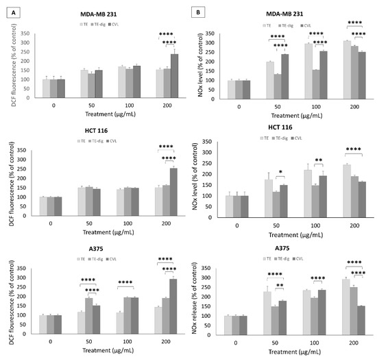Pro-apoptotic effects of TE, TE-dig, and CVL on three cell lines: MDA-MB 231, HCT116, and A375, were assessed by measuring the ROS (A) and NO production (B) using spectrophotometric and fluorometric analyses, respectively. Values are expressed as % of control. Data represent the mean of five independent experiments. Statistical analysis for cell viability data was performed using two-way ANOVA followed by Tukey’s post-test (* p < 0.05, ** p < 0.01, **** p < 0.001).