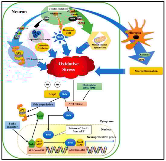 Cartoon showing the dysregulation of oxidative stress-mediated pathways in PD and the utility of the Nrf2/Bach1 signaling pathway as a therapeutic target. Mitochondrial dysfunction, proteasomal impairment, oxidative stress, and neuroinflammation are the key players underlying Parkinson’s pathophysiology. Both environmental factors and genetic mutations of DJ-1, Parkin, PINK1, α-synuclein, and LRRK2 increase oxidative stress, which results in neuronal cell death. Oxidative stress activates the Nrf2 pathway by covalently modifying the Keap1-Nrf2 interaction and releasing Nrf2 to translocate into the nucleus freely. Once in the nucleus, Nrf2 forms heterodimers with the small MAF protein, and this competitively displaces Bach1 from the ARE binding site. This results in the transcriptional activation of antioxidant, anti-inflammatory, and neuroprotective genes that work in unison against PD-associated neurodegenerative pathways. Electrophilic Nrf2 activators can also disrupt the Keap1-Nrf2 interaction and result in the activation of the Nrf2 pathway. Unfortunately, these Nrf2 activators also deplete the GSH levels and contribute to oxidative stress in the neurons, which are already in a compromised state. Bach1, a physiological repressor of Nrf2, occupies the same binding site as Nrf2. Bach1-inhibition by genetic and pharmacological means results in the activation of the Nrf2 pathway, subsequently imparting neuroprotection in PD pathogenesis. The Bach1 inhibitor (HPPE) is a well-established non-electrophile and does not deplete GSH and thus does not contribute to oxidative stress.