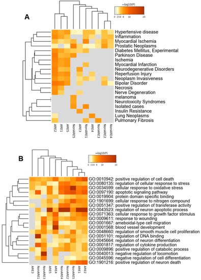 (A) Enrichment of disease terms by gene signatures that contain either ARE or non-ARE genes. (B) Heatmap of enriched biological processes in ARE and non-ARE containing gene signatures.