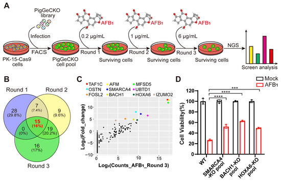 Genome-wide CRISPR/Cas9-based screening to identify genes involved in aflatoxin B1 toxicity. (A) Strategy for CRISPR/Cas9-based aflatoxin B1 (AFB1) resistance screening. PK-15 cells expressing Cas9 (PK-15-Cas9) were transduced with a lentiviral PigGeCKO library to generate a pool of mutant cells (PigGeCKO cell pool). Mutant cells were then subjected to sequential rounds of exposure to AFB1 at increasing concentrations (Round 1: 0.2 μg/mL, Round 2: 1.0 μg/mL, and Round 3: 6.0 μg/mL). AFB1 was refreshed daily until all control cells were killed. Surviving cells were harvested, and sgRNA sequences were identified by high-throughput sequencing. (B) Venn diagram of the top ~0.1% of shared and unique sgRNA target sequences obtained from each round of AFB1 screening. (C) Scatter plots of the frequencies of sgRNA target sequence and the extent of enrichment in transformed PK-15-Cas9 cells in Round 3 of AFB1 screening. (D) Cell viability assays for WT and KO cell pool of candidate genes after AFB1 exposure at 2 μg/mL for 36 h. *** p< 0.001, **** p < 0.0001. p values were determined with two-tailed Student’s t-tests. AFB1, aflatoxin B1; FACS, fluorescence-activated cell sorting; NGS, next-generation sequencing; Round 1 (2 or 3), the first (second or third) round of AFB1 challenge; WT, wild-type; KO, knockout.