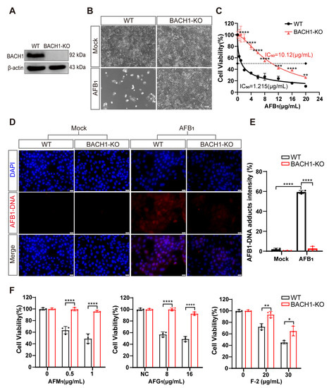 Furthermore, immunofluorescent staining indicated that BACH1-KO cells showed significantly less formation of AFB1-DNA adducts after AFB1 exposure compared with WT cells, with approximately 20-fold lower relative fluorescence intensity than WT cells (Figure 2D,E). Through cell-passaging assays, we found that BACH1-KO cells exposed to AFB1 could be swiftly restored to normal proliferation cycles and cell viability after passaging. In contrast, WT cells exposed to AFB1 were almost non-viable during passaging, which implied that KO of BACH1 may also confer resistance to AFB1-induced genotoxicity (Figure S6A,B). Notably, we observed that cells with KO of BACH1 could tolerate multiple mycotoxins, such as AFM1, AFG1, and Zearalenone (F-2) (Figure 2F). Taken together, these results indicated that BACH1 functions as an essential mediator of cytotoxicity induced by AFB1 or other mycotoxins.