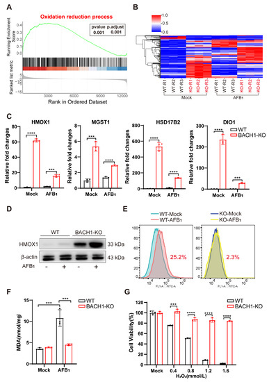 BACH1 regulates the genes involved in mitotic chromatin dynamics, apoptosis, oxidative stress response, and cell cycle [26]. However, no studies have yet reported the link between AFB1 and the molecular mechanism of BACH1 in AFB1 toxicity. We conducted an RNA-Seq analysis to uncover the gene regulatory network relevant to AFB1 toxicity and found significant enrichment for differentially upregulated genes involved in the oxidation–reduction process in BACH1-KO cells. Other studies have reported that AFB1 negatively affects the balance between antioxidants and pro-oxidants, resulting in elevated lipid peroxidation and oxidative damage [23,27]. Oxidative stress is associated with multiple disorders such as cancers, atherosclerosis, and Alzheimer’s disease [28]. Our results showed reduced ROS and MDA in BACH1 KO cells with an increased expression of antioxidant genes such as HMOX1 and MGST1 (Figure 5F). Therefore, BACH1 is a crucial factor in AFB1-induced oxidative damage by regulating the expression of antioxidant genes.
