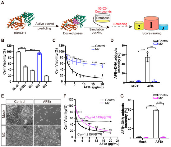 To identify novel potential inhibitors that confer high resistance to AFB1 exposure, we conducted structure-based virtual screening targeting BACH1 using the known structure of human BACH1 protein obtained from the PDB database. We used the Specs small-molecule compound database of 55,024 compounds as the ligand library for virtual docking with human BACH1 (Figure 4A). Ranking the predicted activity scores revealed that compounds M1, M2, and M3 exhibited strong binding energy interacting with hBACH1 (Figure 4A and Figure S10A; abbreviations of and synonyms for M1, M2, and M3 are listed in Table S2). The treatment of Huh7 cells with 10 μg/mL of each compound showed that only exposure to M2 resulted in any significant inhibition of AFB1-induced cell death (Figure 4B). Furthermore, M2 did not affect the cell proliferation in cytotoxicity assays, suggesting that it has no obvious toxic effects on cells (Figure S10B). Subsequently, we found that M2 treatment could also protect cells under increasingly high concentrations of AFB1 in Huh7 cells (Figure 4C). To further study the effects of this inhibitor on cellular resistance to AFB1, we quantified the levels of AFB1-DNA adducts in Huh7 cells exposed to AFB1. The results indicated that M2-treated cells had reduced formations of AFB1-DNA adducts, with approximately fifteen-fold lower relative fluorescence intensity than control cells (Figure 4D).