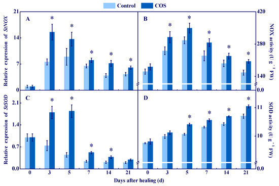 Effect of COS treatment on the relative expression of StNOX (A) and StSOD (C), and the activities of NOX (B) and SOD (D) at wounds of potato tubers during healing. Bars indicate standard error. Asterisks denote significant differences (p < 0.05).