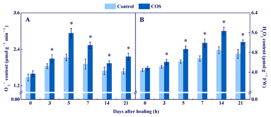 Effect of COS treatment on the contents of O2●− (A) and H2O2 (B) at wounds of potato tubers during healing. Bars indicate standard error. Asterisks denote significant differences (p < 0.05).