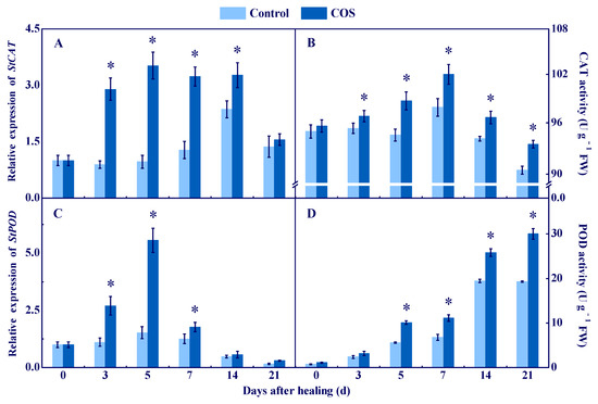 Effect of COS treatment on the relative expression of StCAT (A) and StPOD (C), and the activities of CAT (B) and POD (D) at wounds of potato tubers during healing. Bars indicate standard error. Asterisks denote significant differences (p < 0.05).