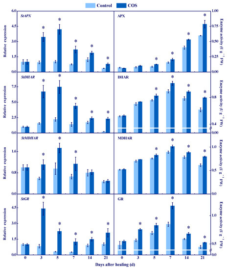 Effect of COS treatment on the relative expression of StAPX, StDHAR, StMDHAR, and StGR, and the activities of APX, DHAR, MDHAR, and GR at wounds of potato tubers during healing. Bars indicate standard error. Asterisks denote significant differences (p < 0.05).