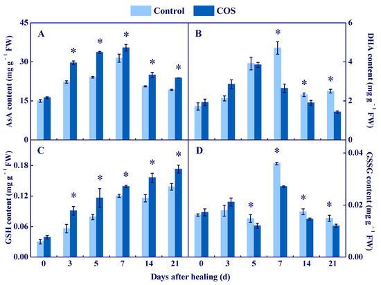 Effect of COS treatment on the contents of AsA (A), DHA (B), GSH (C), and GSSG (D) at wounds of potato tubers during healing. Bars indicate standard error. Asterisks denote significant differences (p < 0.05).