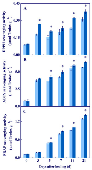 Effect of COS treatment on the scavenging ability of DPPH (A), ABTS+ (B), and FRAP (C) at wounds of potato tubers during healing. Bars indicate standard error. Asterisks denote significant differences (p < 0.05).