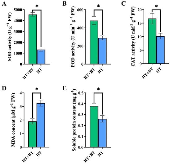 The seed germination activities of the 0 mM and 10 mM betaine soaking treatments were significantly different under heat stress for 24 h. By measuring the antioxidant enzyme activity, MDA content and soluble protein content, we found that the activities of SOD, POD and CAT in the HT + BT treatment were significantly higher than those in the HT treatment (Figure 2A–C) and were increased by 243.06%, 66.10% and 63.37%, respectively. The MDA content in the HT+BT treatment was significantly reduced by 70.69% compared with the HT treatment (Figure 2D), while its soluble protein content was significantly increased by 45.88%, compared with the HT treatment (Figure 2E).