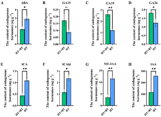 Figure 3. Comparison of hormone levels in HT- and HT + BT-treated seeds: (A) comparison of ABA content; (B) comparison of GA15 content; (C) comparison of GA19 content; (D) comparison of GA24 content; (E) comparison of ICA content; (F) comparison of ICAld content; (G) comparison of ME–IAA content; (H) comparison of IAA content. Each parameter * indicates significant statistical difference, * (p < 0.05), ** (p < 0.01).