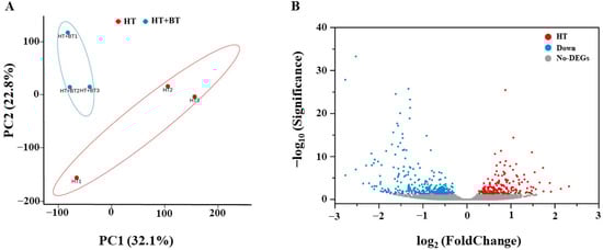 Figure 4. (A) HT and HT + BT treatments were the sources of gene expression variation under heat stress. We used principal component analysis to explore the impact on the variation. (B) Volcano plots of differentially expressed genes (DEGs) between HT and HT + BT; each point represents a gene. The upregulated genes are represented by red dots, the downregulated genes are represented by blue dots, and the genes with no significant differences are represented by gray dots. Under the corrected Q value, the DEG is considered significantly different.