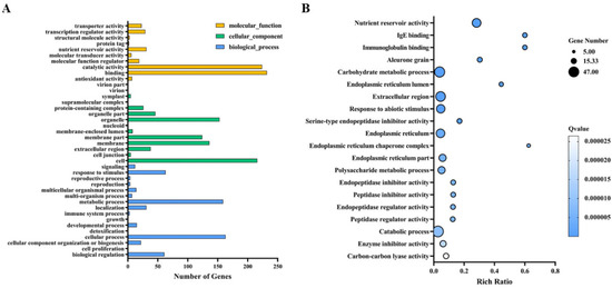 Figure 5. GO term comparison of differential genes with and without betaine soaking treatment under heat stress: (A) GO classification of differential genes; (B) bubble diagram of differential gene GO enrichment.