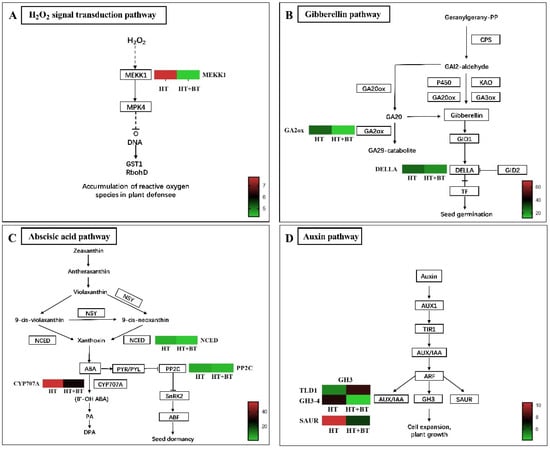 Figure 7. Expression profiles of DEGs in reactive oxygen species accumulation and three endogenous hormone-related pathways: (A) expression profiles of DEGs related to the H2O2 signal transduction pathway under HT and HT + BT treatments; (B) expression profiles of DEGs related to the GA pathway under HT and HT + BT treatments; (C) expression profiles of DEGs related to the ABA pathway under HT and HT + BT treatments; (D) expression profiles of DEGs related to the IAA pathway under HT and HT + BT treatments. The sample names are shown at the bottom of the figure. We indicate changes in expression levels by changes in color: green indicates a lower expression level, whereas red indicates a higher expression level. All data shown reflect the average mean of three biological replicates (n = 3). Means with different letters in each treatment represent a significant difference of p ≤ 0.05.