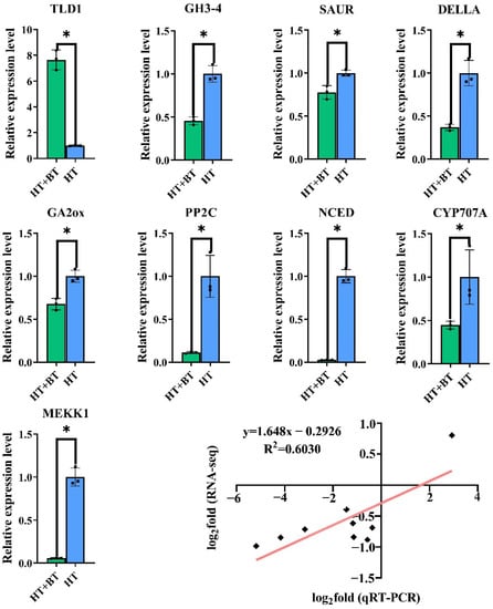 Figure 8. The expressions of 9 differentially expressed genes in the H2O2 pathway and 3 endogenous hormone pathways were randomly verified by qRT-PCR. The x-axis is the name of the treatment, in which HT is the 38 °C non-soaking treatment, and HT + BT is the 38 °C betaine seed-soaking treatment. The y-axis shows the relative expression of a specific gene relative to the reference gene actin. The last panel shows the results of the RNA-seq\qRT-PCR correlation analysis (lower right corner). The x-axis is the log2-fold-change value of the qRT-PCR, and the y-axis is the log2-fold-change value of the RNA-seq. According to the Pearson correlation (R2 = 0.60; p < 0.05), there is a significant positive correlation between the multiple changes in expression. Each parameter * indicates significant statistical difference, * (p < 0.05).