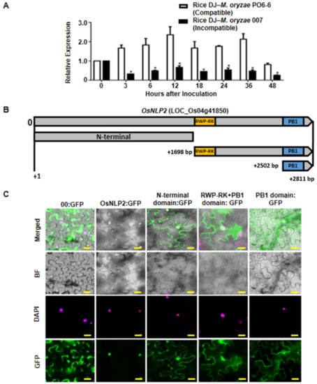 OsNLP2 expression pattern and subcellular localization analysis. (A). Real-time qRT-PCR analyses of OsNLP2 expression in leaf sheaths of rice DJ at different time points after inoculation with Magnaporthe oryzae PO6-6 (virulent) and 007 (avirulent) strains. Transcript levels of the internal control genes OsUbiquitin, 18S rRNA, and OsActin were used to normalize OsNLP2 transcript levels. Relative expression levels were determined by comparing the values at different time points with the 0 h sample values. The data are presented as means ± standard deviation (SD) of relative expression quantities of OsNLP2 in leaf sheaths from the different rice plants (n = 4). Asterisks indicate significant differences, as determined by Student’s t-test (p < 0.05). (B). Domain alignment of OsNLP2. The OsNLP2 coding region is 2,811 bp. OsNLP2 contains two functional domains (RWP-RK and PB1). Sequences and putative domain alignment were analyzed based on gene information from the rice genome annotation project (http://rice.plantbiology.msu.edu/, accessed on 5 June 2016) and the National Center of Biotechnology Information (NCBI, https://www.ncbi.nlm.nih.gov/, accessed on 5 June 2016). (C). Subcellular localization of OsNLP2:GFP and its truncated regions with either of the functional domains in N. benthamiana cells. DAPI counterstaining was performed to visualize nuclei. GFP and DAPI fluorescence were observed under a fluorescence microscope (Zeiss equipped with Axioplan 2) with a GF filter (Ex/Em: 488 nm/505–550 nm wavelengths) and DAPI filter (Ex/Em: 405/421–523 nm). ‘Merged’ shows the merged images of BF, GF, and DAPI. BF, bright field; GF, green fluorescence; GFP, green fluorescent protein; hpi, hours post infiltration. Scale bars = 10 μm.