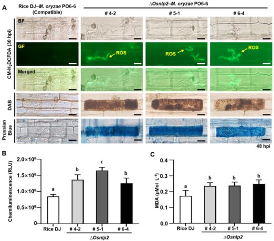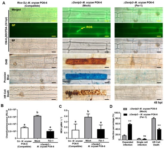 The oxidation of lipids or lipid peroxidation is generated by ROS (hydroxyl radical and hydrogen peroxide) effects on polyunsaturated fatty acids in the membrane, resulting in significant tissue damage []. MDA, an indicator of lipid peroxidation, was quantified spectrophotometrically after reaction with TBA [,]. We analyzed lipid peroxidation in rice DJ and ΔOsnpl2 leaf sheaths infected with virulent and avirulent M. oryzae strains. Lipid peroxidation (MDA) levels were both induced in DJ and ΔOsnlp2 cells infected with M. oryzae race 007 (Figure S5C). However, it was significantly higher in ΔOsnlp2 than in DJ cells infected with M. oryzae PO6-6 (Figure 3C), indicating that higher ROS and Fe3+ levels enhance oxidative stress levels in ΔOsnlp2 cells. ROS and ferric ion accumulation and the induced cell death indicated the ferroptosis was involved in the defense responses in ΔOsnlp2 mutant cells during the M. oryzae infection process.