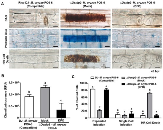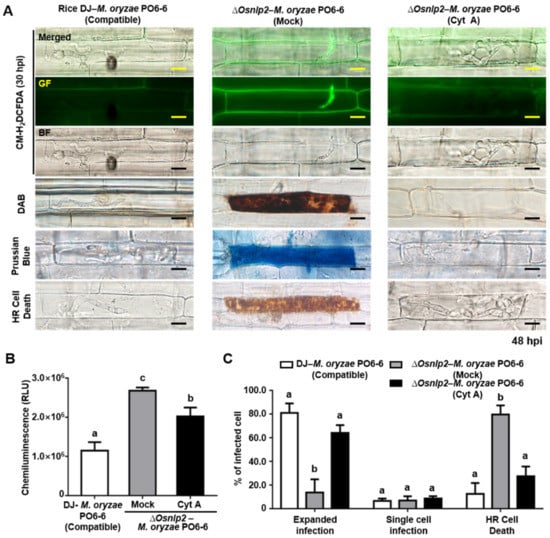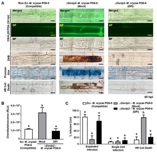 Conidial suspension (5 × 105 conidia mL−1) of virulent M. oryzae PO6-6 or avirulent M. oryzae 007 with Cyt A (20 µg mL−1) or DPI (5 µM) solution was inoculated on rice leaf sheaths. Cyt A treatment suppressed the M. oryzae-induced accumulation of ROS and Fe3+ and HR cell death in ΔOsnlp2 leaf sheath cells, as shown in the images of CM-H2DCFDA, DAB, and Prussian blue staining (Figure 6A and Figure S9A). The chemiluminescence assay showed that ROS production in ΔOsnlp2 leaf sheaths was significantly suppressed at 48 hpi after Cyt A treatment (Figure 6B and Figure S9B). Both virulent and avirulent M. oryzae strains grew well with normal hyphal structures in ΔOsnlp2 leaf sheath cells treated with Cyt A (20 µg mL−1) (Figure 6A,C). DPI (5 µM) distinctly inhibited the accumulation of ROS and ferric ions and HR cell death in ΔOsnlp2 leaf sheaths infected with M. oryzae PO6-6 or M. oryzae 007, leading to successful IH colonization (Figure 7 and Figure S9). ROS and iron accumulation were hardly to be detected in ΔOsnlp2 cells after DPI treatment (Figure 7A and Figure S9A). Chemiluminescence quantification indicated that DPI significantly suppressed ROS production in ΔOsnlp2 leaf sheaths at 48 hpi (Figure 7B and Figure S9B). DPI treatment distinctly promoted M. oryzae PO6-6 and M. oryzae 007 infection but inhibited HR cell death in ΔOsnlp2 leaf sheaths (Figure 7C and Figure S9C).