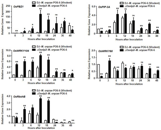 Real-time qRT-PCR analysis of time-course expression of some defense-related genes in leaf sheaths of rice DJ and ΔOsnlp2 mutant (#4-2) plants during virulent Magnaporthe oryzae PO6-6 infection. Relative expression levels of OsPBZ1, OsPIP-3A, OsWRKY104, OsWRKY90, and OsRbohB at different time points after inoculation were obtained by normalizing with respect to the expression levels of the internal control OsUbiquitin. The data are means ± SD of relative gene expression levels in rice leaf sheaths from three independent experiments. Asterisks indicate significant differences as determined by Student’s t-test (p < 0.05, p < 0.01). ns, not significant.