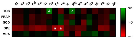 Negative correlations between OS markers and metals were observed (Figure 1, Table S1). Nevertheless, only interactions of Fe and Hg with GPx were significant (p < 0.05). On the contrary, a positive effect was monitored between oxidative status and Cu (p < 0.01) and Mg (p < 0.05).