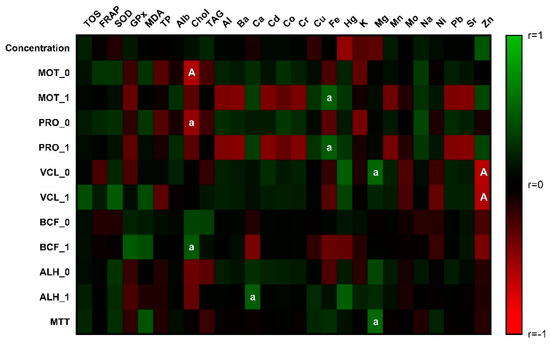Correlations: spermatozoa parameters vs. markers of oxidative stress, biochemical parameters, and chemical elements. The level of significance: a (p < 0.05); A (p < 0.01).