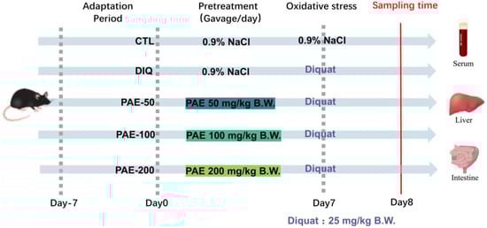All animal studies were performed in accordance with the guidelines of the Animal Ethics Committee of Zhejiang University (Ethical protocol code ZJU20160403). Forty C57BL/6 mice (20 ± 2 g), 8-week-old males, were purchased from Slac Laboratory Animal Co., Ltd. (Shanghai, China). As shown in the scheme (Figure 1), after 7 days of adaptation, the mice were randomly divided into 5 groups (n = 8 per group): a control group (CTL), the diquat model group (DIQ), the low dose of PAE group (PAE-50), the medium dose of PAE group (PAE-100), and the high dose of PAE group (PAE-200). By oral gavage, the control and diquat groups were given 0.9% NaCl (normal saline), and the PAE-50/100/200 groups were given PAE (50/100/200 mg/kg B.W.), respectively, at 9:00 a.m. for seven days (Days 0–6). On Day 7, the mice in the control group were administrated saline by intraperitoneal injection, meanwhile other groups were injected diquat (25 mg/kg B.W., Dr. Ehrenstorfer GmbH, Augsburg, Germany), and the samples were collected after 24 h. During the experiment, the mice were fed with a basal diet and kept in 12 h light/dark cycle at 20–26 °C.
