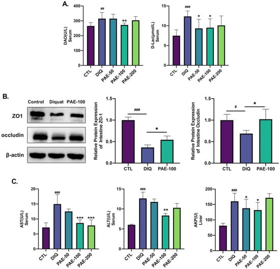 Effects of PAE on intestinal barrier and liver function in diquat-induced mice: (A) Analysis of intestinal permeability parameters (DAO, D-Lac) in serum by ELISA (n = 8); (B) analysis of the relative protein expression level (ZO-1, occludin) in intestine by WB (n = 3); (C) analysis of parameters of liver injuries (AST, ALT in serum, and AKP in liver) (n = 8). All data were represented as means ± SD. # p < 0.05, ## p < 0.01, and ### p < 0.001 as compared with the CTL group; * p < 0.05, ** p < 0.01, and *** p < 0.001 as compared with DIQ group.