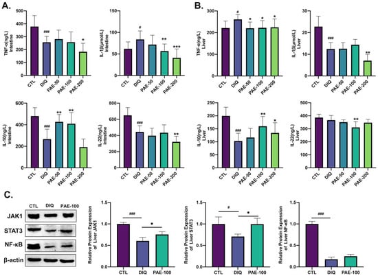 Effect of PAE on inflammation of the intestine and liver in diquat-treated mice: (A) Analysis of proinflammatory cytokines (TNF-α and IL-1β) and anti-inflammatory cytokines (IL-10 and IL-22) in the intestine (n = 8); (B) analysis of proinflammatory cytokines (TNF-α and IL-1β) and anti-inflammatory cytokines (IL-10 and IL-22) in the liver (n = 8); (C) analysis of the relative protein expression levels (JAK1, STAT3, and NF-κB) in the liver (n = 3). All data were represented as means ± SD. # p < 0.05, and ### p < 0.001 as compared with the control group; * p < 0.05, ** p < 0.01, and *** p < 0.001 as compared with the diquat group.