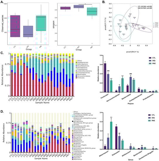 The results of the alpha-diversity analysis are shown in Figure 6A. Diquat downregulated the observed species in mice, but was not considered to be statistically significant, while PAE pretreatment lessened this result. A higher Simpson index was observed in the diquat-treated group, whereas PAE significantly reduced the Simpson index. The beta-diversity analysis is shown in the principal coordinates analysis (PCoA) scatterplot (Figure 6B), the data of the weighted UniFrac PCoA analyzed by Adonis illustrated that the difference between the control or PAE-pretreated groups and the diquat-treated group was significant.