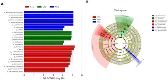 The analysis of LEfSe and LDA based on OTUs characterized the microbiomes of cecum in mice: (A) LDA score histogram shows taxonomic biomarkers (the LDA score (log10) > 4); (B) LEfSe evolutionary cladogram shows the phylogenetic distribution of the cecal microbe. PAE, PAE-100 (100 mg/kg) group.