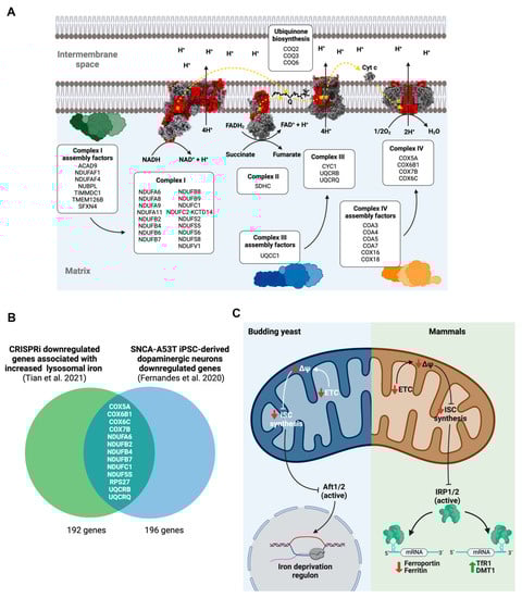 Mitochondrial electron transport chain dysfunction triggers iron accumulation in neurons. (A) CRISPRi of several genes associated with mitochondrial electron transport chain components (boxes), including complexes I, II, III and IV subunits (colored red in the atomic structure); numerous assembly factors and enzymes in the ubiquinone biosynthesis pathway induces lysosomal iron accumulation in human iPSC-derived glutamatergic neurons. (B) CRISPRi downregulated genes associated with iron accumulation also show diminished expression in a cellular model of PD (SNCA-A53T-expressing dopaminergic neurons). Most of these genes encode mitochondrial ETC subunits [16,20]. (C) Comparative model between yeast and human cells of the regulatory mechanism linking dysfunctional mitochondrial ETC with iron regulation through ISCs synthesis.