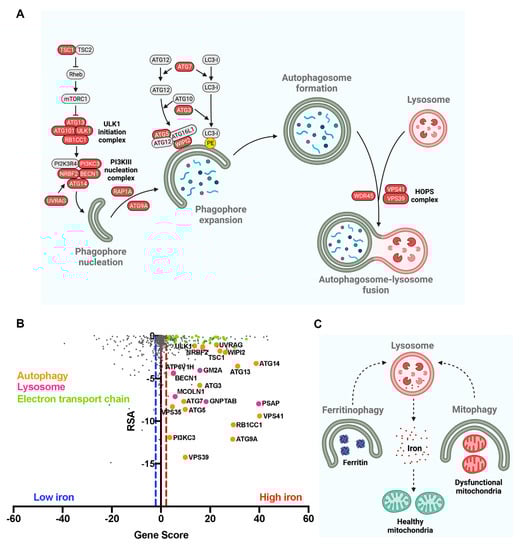 Our analysis revealed that numerous genes whose repression generates lysosomal iron accumulation participate in the macroautophagic process (Figure 2A).