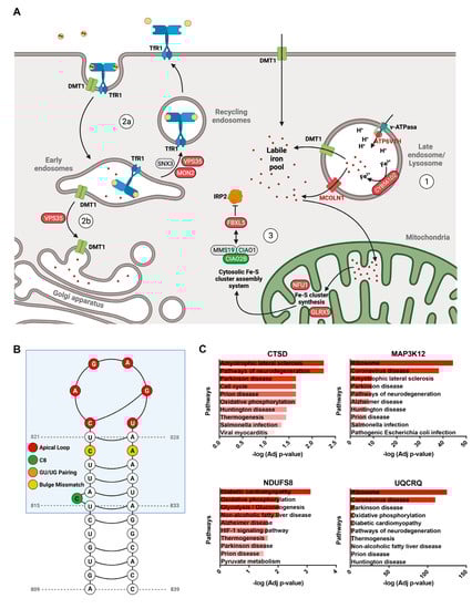 Poorly characterized proteins that contribute to upholding iron homeostasis in neurons. (A) Many CRISPRi-targeted genes associated with altered iron levels (increased in red, decreased in green) are connected to the key mechanisms of homeostatic control of this metal. These included lysosomal proteins responsible for iron exit from endolysosomal compartments (1); retromer complex subunits involved in TfR1 (2a) and DMT1 (2b) intracellular trafficking and proteins involved in the regulation of IRP2 levels (3). (B) The putative 2D structure of IRE localized in the mRNA of VHL. (C) KEGG pathways associated with DEG obtained from CRISPR-mediated genetic perturbations coupled to single-cell RNA sequencing identify a potential link between the genes involved in iron homeostasis and neurodegeneration.