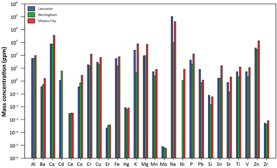 In terms of metal compositions of the three sets of UF-RDPs, it is notable that nearly all metals analysed are most abundant in the Mexico City UF-RDPs (18 out of 24), compared to the UK samples (Figure 2; Supplementary Table S2). For example, mass concentrations of Cu and Fe are 67.2 ppm and 77.1 ppm for Mexico City, followed by 29.1 ppm and 55.9 ppm for Lancaster and 19.7 ppm and 14.7 ppm for Birmingham. Conversely, Na is most abundant in the Lancaster UF-RDPs (105,489 ppm), followed by Mexico City (42,163 ppm) and Birmingham (1003 ppm). Pb concentrations are 8.0 ppm for Lancaster, 1.2 ppm for Mexico City, and 0.7 ppm for Birmingham. Cd was the only analysed element occurring in the greatest concentrations in the Birmingham UF-RDPs (6.1 ppm), followed by Lancaster (1.1 ppm) and Mexico City (below detection limit).