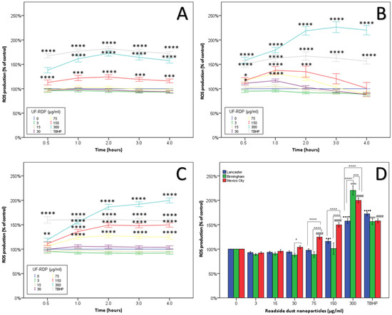 At the maximum dose (300 µg/mL), intracellular ROS levels were elevated within 30 min of exposure to the UF-RDPs from all three cities. Lancaster UF-RDPs were least potent in terms of ROS generation; in contrast, higher ROS concentrations were observed following Birmingham and Mexico City UF-RDP exposures (Figure 4). Together, these data suggest that the lower ROS levels induced by Lancaster UF-RDPs could stimulate proliferation (increased cell viability), whereas the higher ROS levels induced by Mexico City (and Birmingham) UF-RDPs result in cell death via oxidative damage. Some similar responses have been reported for RD samples ≤2.5 µm and ≤10 µm. Up to 180% increased ROS production was observed in human corneal epithelial cells after 24 h exposure to RD from residential areas of the city of Gangdong-Gu, Korea [59]. Re-aerosolised RD2.5 from 10 Chinese cities displayed correlation between cellular ROS production and heavy metal concentrations (Cr, Mn, Zn, Ni, Pb) [55].