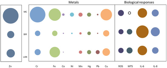 Summary of biological responses and heavy metal concentrations of UF-RDPs from Lancaster, Birmingham, and Mexico City in Calu-3 cells. The bubble plot depicts the relative abundance of selected metals (ppm) in UF-RDPs from Mexico City (MC), Birmingham (BIR), and Lancaster (LAN). The concentration of Zn is ~10-fold greater than the other metals so has been scaled separately. The biological responses to 75 µg/mL UF-RDPs are represented as percentages of the untreated control, measured at 24 h (MTS, IL-6, and IL-8) or 4 h (ROS). Solid black outline indicates a decrease, whilst filled circles indicate increases.