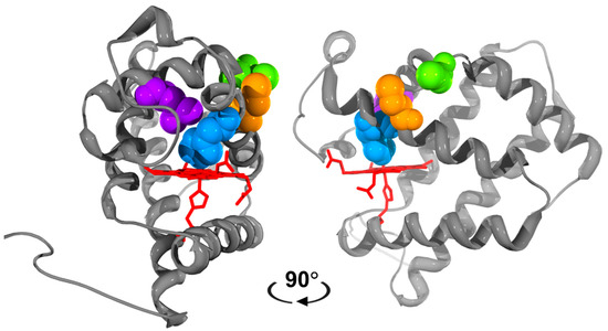 Targeted mutagenesis of residues in the distal pocket of Mb, hemoglobin (Hb), and Ngb have been shown to specifically modulate either the NiR or/and NOD activities [32,33]. The NiR activity of Ngb was increased ~2000 times by mutation of the distal E7 histidine ligand [32]. A recent investigation into the effects of E7 mutation on Cygb NiR mutations showed varied effects ranging from 0.9 to 1100 M−1 s−1 [34]. Bimolecular ligands like NO have been shown to migrate to the distal coordination site of Hb through the rear of the heme pocket, to access the central iron. The distal histidine acts like a gate rotating out of place to enable biomolecular ligands to ligate to the central heme iron [35]. This mechanism can be impeded by removing the space at the rear of the heme pocket with large hydrophobic residues, such as phenylalanine or tryptophan, hampering access to the distal coordination site [33,35]. Mutation of neighboring residues of the distal histidine such as Leu(B10) was effective in decreasing the NOD activity of Hb and Mb by an order of magnitude [35,36]. These key amino acids that influence various molecular activities of globins, mapped onto the structure of Cygb, are shown in Figure 1.