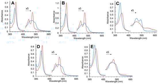 Optical spectra of deoxyferrous cytoglobin before (red) and after (blue) binding NO (720 µM) for wild type (A), Cys38Ser/Cys83Ser (B), His81Ala (C), Leu46Phe (D), and Leu46Trp (E). Visible region over 500 nm is multiplied by five for clarity.