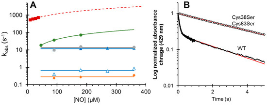 The reaction of NO with oxyferrous Cygb is shown in Figure 5, and rate constants are summarized in Table 1. Here, the NO reacts with the oxygen bound to Cygb to generate nitrate (via peroxynitrite) and ferric Cygb (Fe2+ = O2 + NO → Fe3+−ONO− → Fe3++ NO3−). The issue with monitoring this reaction is that it is typically very fast, with rate constants reported using other globins typically >1 × 108 M−1 s−1 [39]. For the WT Cygb, optical changes are observed (Figure 5A). However, the spectrum immediately following NO addition to oxyferrous Cygb (~1.2 ms by stopped-flow measurement) is not that of the oxyferrous species but a mainly pentacoordinate ferric Cygb. Therefore, the optical changes observed are typical of the ferric protein relaxing from a pentacoordinate to a hexacoordinate state, with the NOD reaction being largely missed within the dead time of the stopped-flow spectrophotometer (<1.2 ms). The kinetics of this relaxation approaches 284 s−1, fitting to a hyperbola as a function of NO concentration (Figure 5B). The dependence on NO concentration of the rate constant observed in Figure 5 for the WT, Cys38Ser/Cys83Ser, and Leu46Phe, we attribute to the fact that at low NO concentrations the NOD reaction is not fully completed. Thus, at these concentrations, the kinetics are confounded by contributions from two processes, namely for the formation of the ferric and the binding of the distal histidine.