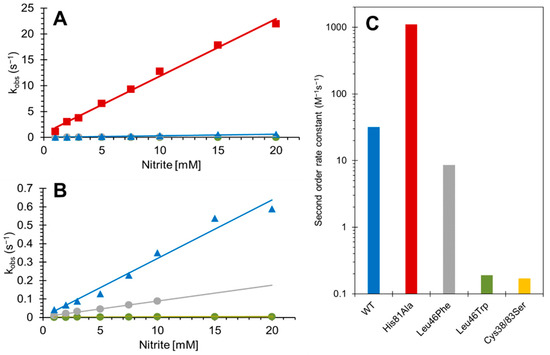 The kinetics of the NiR activity of Cygb are shown in Figure 4 and summarized in Table 1. The WT monomer with intramolecular disulfide is shown as a function of nitrite concentration, and the second-order rate constant was 31.7 ± 2.1 M−1 s−1, essentially identical to that reported previously [4]. The Cys38Ser/Cys83Ser double mutant showed a NiR second-order rate constant of 0.17 ± 0.01 M−1 s−1, slightly lower than the 0.63 reported for monomer with free sulfhydryl, but closer to the 0.23 M−1 s−1 reported for a double cysteine to arginine mutant [4]. The Leu46Phe and Leu46Trp mutations exhibited NiR rate constants of 8.54 ± 0.25 M−1 s−1 and 0.19 ± 0.01 M−1 s−1, respectively, showing that the phenylalanine and tryptophan mutations in the heme pocket slow NiR activity to different extents. Finally, the His81Ala mutation leads to an NiR of 1108 ± 38.0 M−1 s−1, identical to that recently reported [34]; this is 35-fold higher in the rate of nitrite consumption compared to the WT with intramolecular disulfide, and 6500-fold higher compared to the double cysteine mutant.