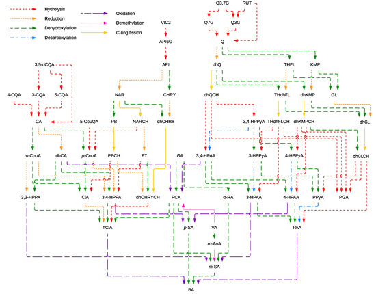 Quercetin glycosides such as quercetin 3,7-diglucoside (Q3,7G), quercetin 3-glucoside (Q3G), quercetin 7-glucoside (Q7G), and rutin (RUT), were hydrolyzed into quercetin (Q), which in turn was dehydroxylated into 3,3′,5,7-tetrahydroxyflavone (THFL) and kaempferol (KMP) and reduced into dihydroquercetin (dhQ). On the other hand, vicenin-2 (VIC2) was hydrolyzed into apigenin 6-C-glucoside (API6G), which was subsequently hydrolyzed into apigenin (API). Apigenin was transformed into naringenin (NAR) and chrysin (CHRY) by reduction and dehydroxylation, respectively. After further transformations (reduction, dehydroxylation, and C-ring fission), flavonols and flavones yielded different chalcones, which hydrolysis resulted in hydroxyphenylpropionic, hydroxyphenylpyruvic, and hydroxyphenylacetic acids. Phenylacetic (PAA) and hydrocinnamic acids were the primary metabolites obtained from the colonic metabolism of flavonols and flavones, respectively, ultimately generating benzoic acid.
