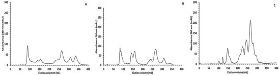 Size exclusion chromatography profile of protein and peptides after different phases of digestion of the whey-beverage (Colada). (A) Oral phase, (B) gastric phase, (C) intestinal phase (complete digestion).