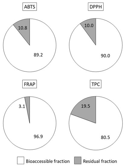 Both antioxidant properties and polyphenols post digestion were mainly located in the bioaccessible fraction (90–97% of ABTS, DPPH and FRAP; 80% of polyphenols, Figure 3), which included compounds released from the food matrix that are potentially absorbable from the lumen. In the residual fraction, usually discarded when studying bioavailability of bioactive compounds, there still remained low but appreciable amounts of antioxidant activity (10% of radical scavenging ability) and phenolic compounds (20%). These may exert antioxidant and anti-inflammatory local action [] or be metabolized by the intestinal microbiota in potentially absorbable complexes [].