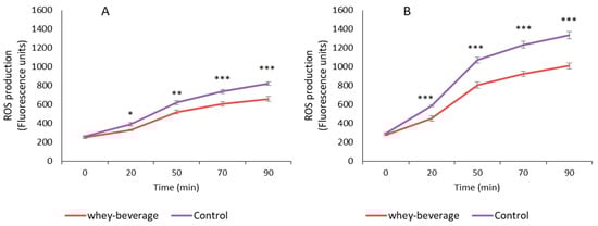 ROS generation expressed as fluorescence units during 90 min (mean ± SE) in Caco-2 cells pre-incubated with BF of the whey beverage compared with control cells incubated with culture medium. (A) Basal conditions. (B), oxidative stress induced with t-BOOH 10 mM. *, p < 0.05; **, p < 0.01; ***, p < 0.001.