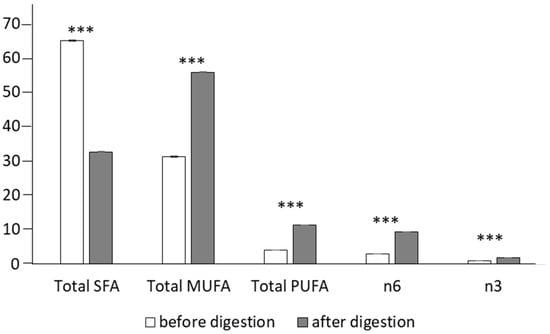 Fatty acid indexes before and after the in vitro digestion of the whey-beverage; SFA: saturated fatty acids; MUFA: monounsaturated fatty acids; PUFA: polyunsaturated fatty acids. Asteriscs means significant differences (one-way ANOVA and LSD test, *** p < 0.001).