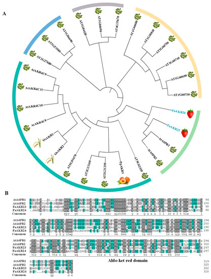 Phylogenetic analysis and multiple sequence alignment of AKR proteins. (A) Phylogenetic analysis of AKRs. At, Arabidopsis thaliana; Fa, Fragaria × ananassa; Os, Oryza sativa.L; Pp, Prunus persica. The full-length protein sequences are provided in Table S1; (B) multiple sequence alignment was performed using the protein sequences of FaAKR23, FaAKR24, AtA6PR1, and AtA6PR2; the Aldo-ket red domain is labeled by a gray line.